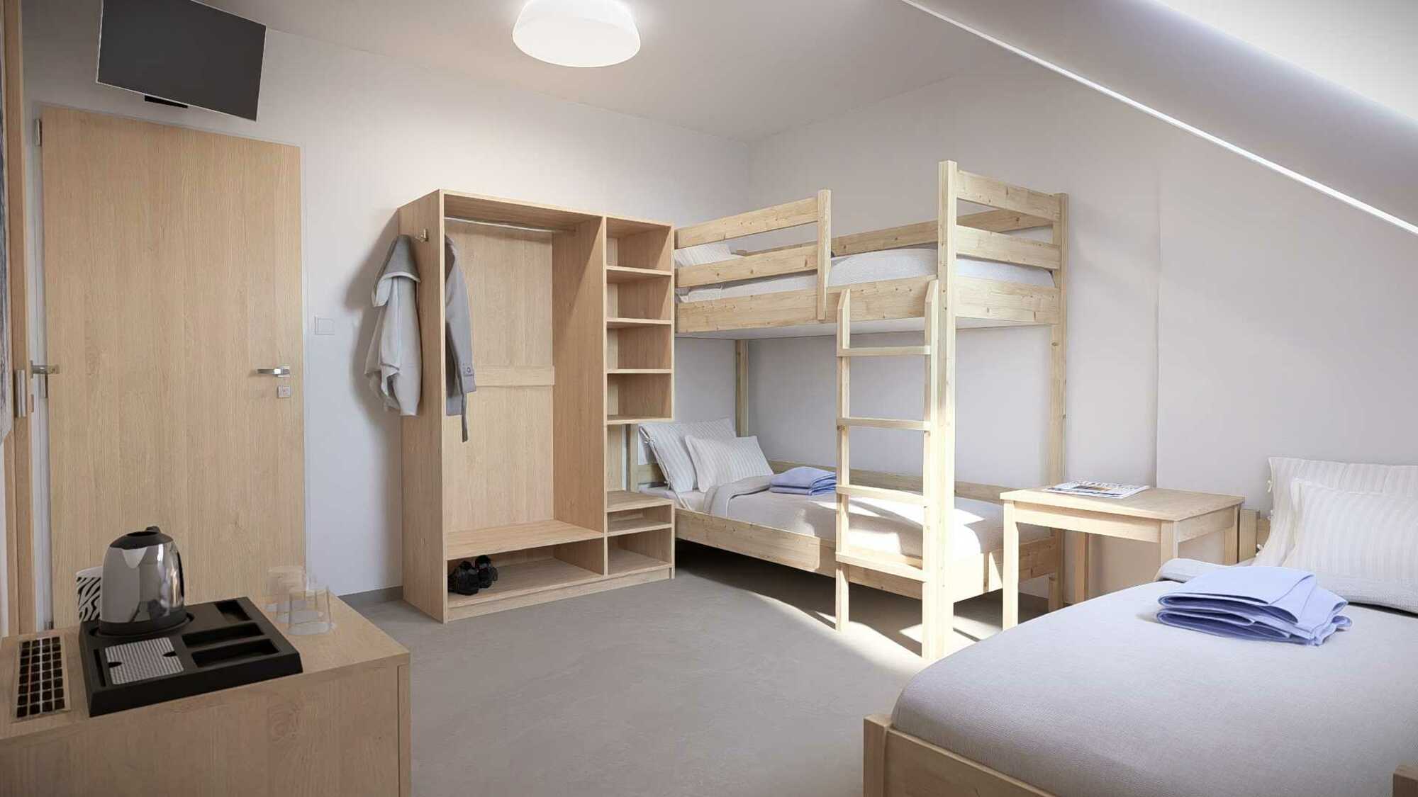 Prakticky zařízený třílůžkový pokoj se společným sociálním zařízením je vhodný pro menší rodinu, přátele nebo hosty, kteří hledají pohodlné a cenově dostupné ubytování.Pokoj je vybaven jedním samostatným lůžkem a jednou patrovou postelí pro 2 osoby. Sociální zařízení se nachází hned naproti pokoji a je rozděleno na pánskou a dámskou část. Každá část je vybavena dvěma sprchami, dvěma toaletami a dvěma umyvadly, což zajišťuje pohodlí i při vyšší obsazenosti.Vybavení pokoje: